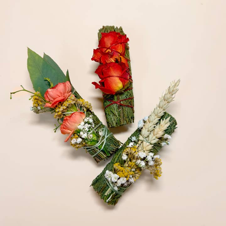 Shop › Herb Bundles Image 1 of 5 Image 2 of 5 Image 3 of 5 Image 4 of 5 Image 5 of 5 Herb Bundles from $12.00 Color: Select Color Citrus Cedar Lavendar Selenite Thyme Spice Autumn Mugwort Cedar + Palo Santo Get notified by email when this product is in stock. Quantity: Add To Cart Added!