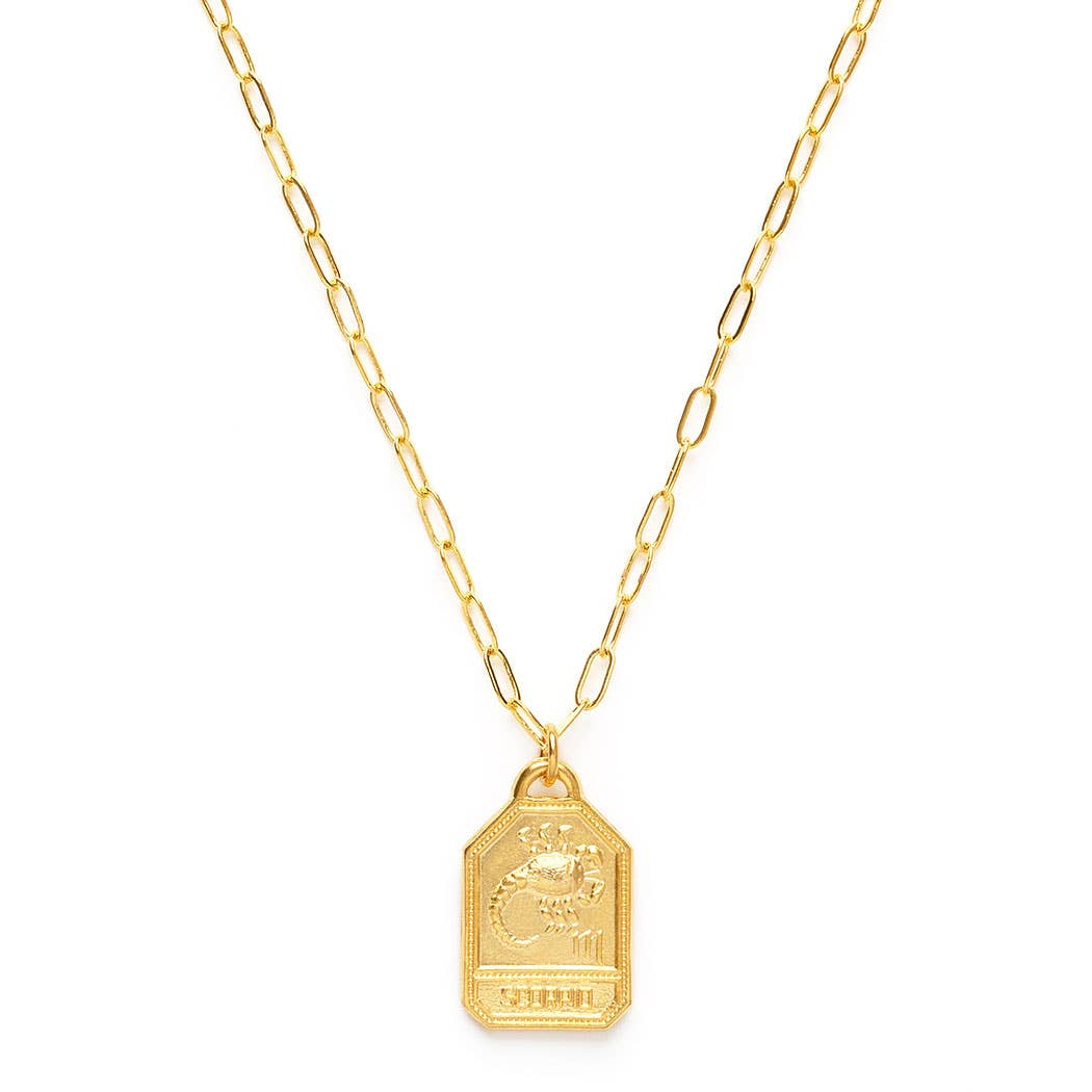 Zodiac pendant are made with vintage molds and measure .5" and hangs on 18" drawn cable chain made of brass with bright 14K gold plate. Designed and assembled in our Sonoma California studio.